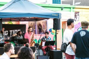Decked out for a party, local artist Billie Jo Porter kicked off the good vibes and Pablo Blitzer rocked out the sax with the guys from Sunset Strut trio playing into the night ![]()